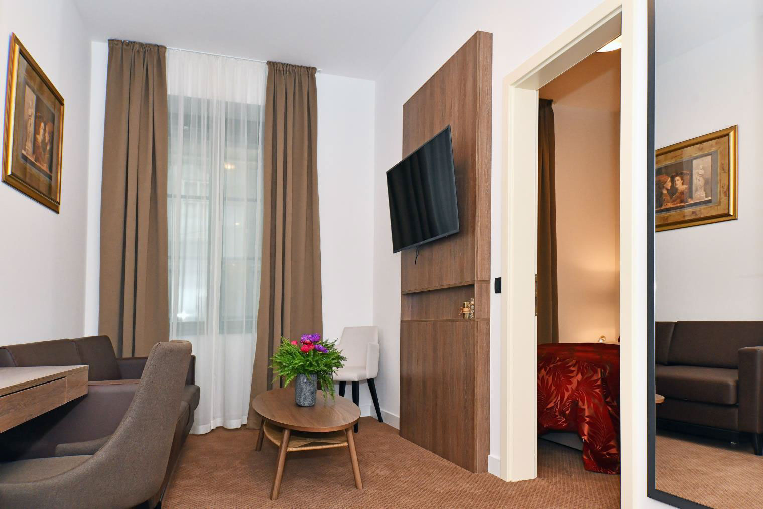 This modernly furnished suite, overlooking the picturesque Ilica street, features a separate living room and a bedroom with a king-size bed, and provides its guests with a pleasant environment for both work and relaxation. Each suite has a spacious bathroom with a shower, cosmetics, a hair dryer and a bathrobe. Within every suite, there is a work desk, a direct dial telephone, an LCD TV with a variety of channels, individually regulated air conditioning, a minibar, a safe and unlimited Wi-Fi.
